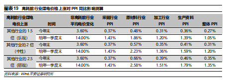 按各行業在生產資料及整體工業品中的佔比,同樣可以計算出其他行業用電均價上漲1%,當高耗能行業用電價格的漲幅是其他行業的1.5倍時, PPI生產資料以及整體PPI受到的影響分別爲0.10%、0.075%。按照相同的方法,也可以計算出高耗能行業電價上漲更大幅度時的情況。我們測算顯示:在高耗能行業煤電電價上漲幅度爲其他行業1.5倍、2倍、2.5倍的情況下,對今年末PPI的額外影響分別爲0.27%、0.31%、0.35%,對明年一季度末PPI的額外影響分別爲1.05%、1.20%、1.35%(圖表19)。可見,高耗能行業電價的上漲對於PPI同比讀數的額外影響不可忽視。