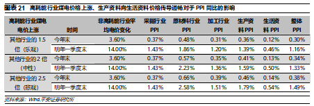在此情況下,我們的測算顯示,當高耗能行業煤電價格上漲幅度分別爲其他行業的1.5倍、2倍、2.5倍時,對今年末PPI的額外影響分別爲0.30%、0.34%、0.38%,對明年一季度末PPI的額外影響分別爲1.16%、1.33%、1.49%(圖表21)。