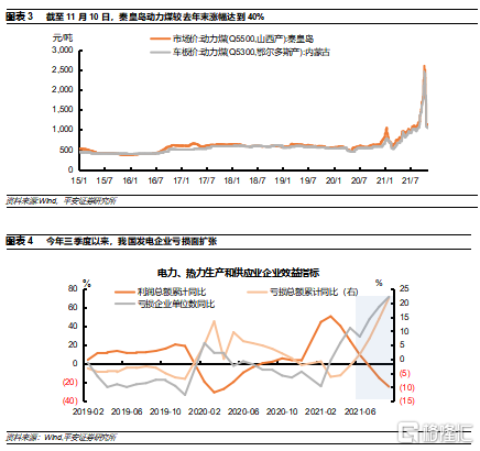儘管近期國內煤炭保供穩價政策加碼,動力煤價格從高點迅速回落,但相比於新冠疫情前仍處高位。截至今年11月10日,年內秦皇島動力煤市場價漲幅仍達40%(圖表3)。結合今年三季度發電企業虧損面大幅擴張的事實(圖表4),我們認爲短時間內電價難以隨着煤炭價格的回落而下降,相反還會繼續體現電力市場化改革的上浮作用。因此,本文試圖梳理煤電市場化改革的內容和影響,定量測算本次改革對於工業企業用電價格以及對我國PPI同比的影響。在居民和農業用電保持穩定的情況下,電力市場化改革對CPI的影響主要通過PPI向CPI的傳導體現。考慮到目前PPI向CPI傳導尚不通暢,可以認爲電力市場化改革對CPI的影響相對輕微。