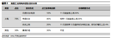 但這並不意味着工業企業的用電成本也將一次性上漲20%。由於工業企業用電的來源和交易方式不同,本次煤電市場化改革所帶來的影響將在未來幾個月內逐步顯現。長期以來,火電在我國總發電量中的佔比約爲70%,其餘30%來自水電、核電及風電等(圖表7),這部分電力價格並不在本次改革的範圍內;而在70%的火電中,使用交易定價的佔比爲70%,另外30%目前仍然使用基準價格,而本次改革要求全部火電進入電力市場;在電力市場交易的火電中,約有80%爲年度長協定價,這部分電力將在年底重新簽訂協議,並於明年初調整價格,剩餘20%爲現貨及月度長協交易,價格調整較爲靈活。