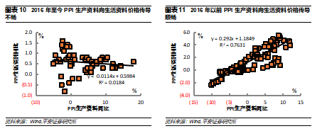 2016年以來,由於終端消費需求疲軟,下遊生活資料生產行業的議價能力較弱,上遊生產資料價格向下遊生活資料價格的傳導不再通暢(圖表9、圖表10、圖表11)。而使用投入產出表估算能源價格變化對PPI和CPI影響的一個前提條件是,不同行業間物價的傳導是即時、通暢的,因此,若直接使用投入產出表進行測算可能會高估本次煤電市場化改革的影響。在PPI內部、PPI到CPI之間價格傳導不暢的情況下,我們在基準情形中,僅討論生產資料中採掘、原材料、加工三大行業所受到的直接和間接影響,以及對整體PPI的影響。