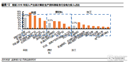 從直接渠道來看,根據2018年我國投入產出表計算,電力投入在採掘、原材料、加工三個領域總投入中的佔比分別爲10.2%、5.3%、2.7%(圖表12),對應電價每上漲1%三個領域產品價格將分別上漲0.102%、0.053%、0.027%。