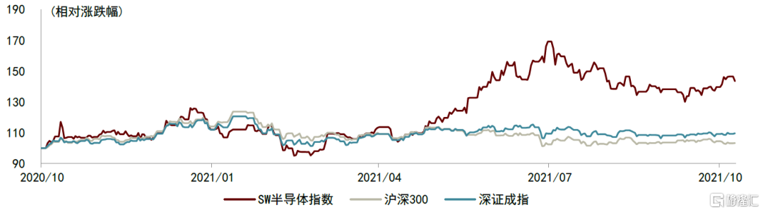 2020年底至今,疫情、自然災害等多重因素交織,影響了全球半導體供應鏈,導致芯片短缺,手機、汽車、安防等行業均受到較大影響。缺貨導致的芯片銷售價格上漲使得芯片設計企業獲得了較快的利潤增速;製造端,晶圓廠、封測廠基本實現滿產,ROE得以提升;同時伴隨着國產化率提升,國內設備材料企業利潤釋放,1-3Q21產業鏈各環節均維持了較高的收入及盈利增速。受上述因素影響,半導體指數(申萬行業分類)在2021年4月至7月之間顯著跑贏大盤。但8月至10月板塊整體出現階段性回調,細分板塊之間與板塊內股價表現分化,我們認爲主要是因爲多重指標使得市場對2022年半導體行業各領域景氣度的判斷產生分歧。首先,下遊市場需求出現結構性分化,汽車電子、新能源發電端(光伏、風電及儲能)相關芯片需求旺盛,消費、通信相關芯片需求出現減弱趨勢;其次,市場預計全球部分新增晶圓製造和封測產能將在2022年開出,因此市場擔心對供需關係造成不利影響。