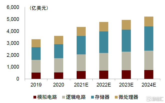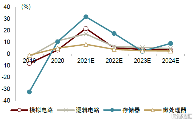 集成電路領域,存儲器市場規模預計增長較快。WSTS預計2021年全年模擬電路/邏輯電路/存儲器/微處理器的市場規模分別爲677/1,386/1,548/753億美元,預計到2024年市場規模分別達到762/1,622/2,024/822億美元。