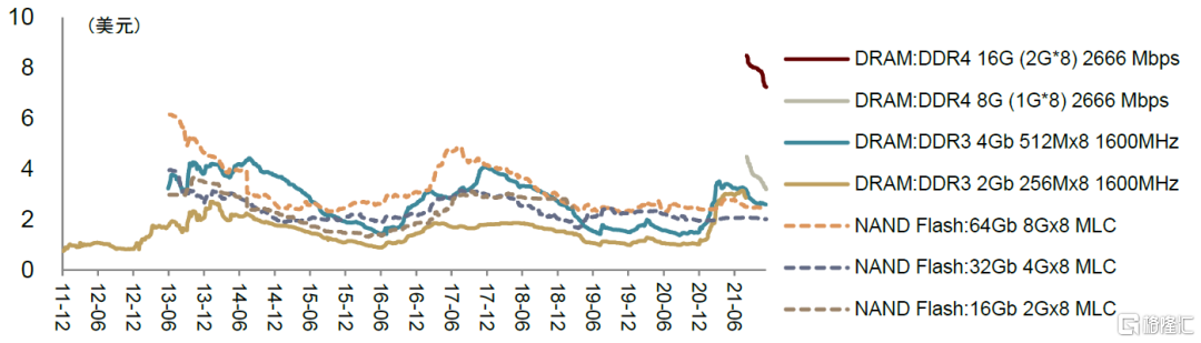 存儲器芯片價格回調,下遊需求缺口有所緩和。自2021年底以來,DDR3 DRAM單價顯著上漲,NAND Flash單價穩中有升。2021年中之後,供需緊張狀態有緩和,DRAM和NAND Flash芯片價格均有所回落,下遊需求缺口有所緩和。