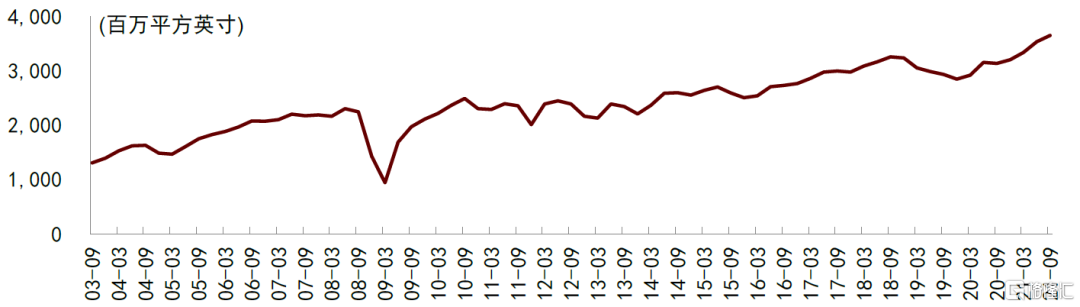 硅片出貨量持續創新高。據SEMI數據顯示,2021年1-9月全球硅片出貨量爲105.2億平方英寸,同比增長14.3%,需求上升趨勢顯著;3Q21全球硅片出貨量爲36.49億平方英寸,處於歷史最高點。