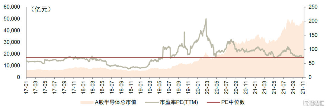 圖表:A股半導體板塊市值與TTM P/E變化情況