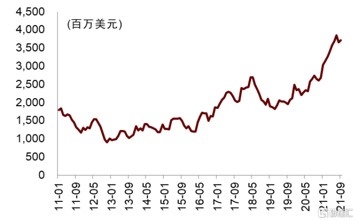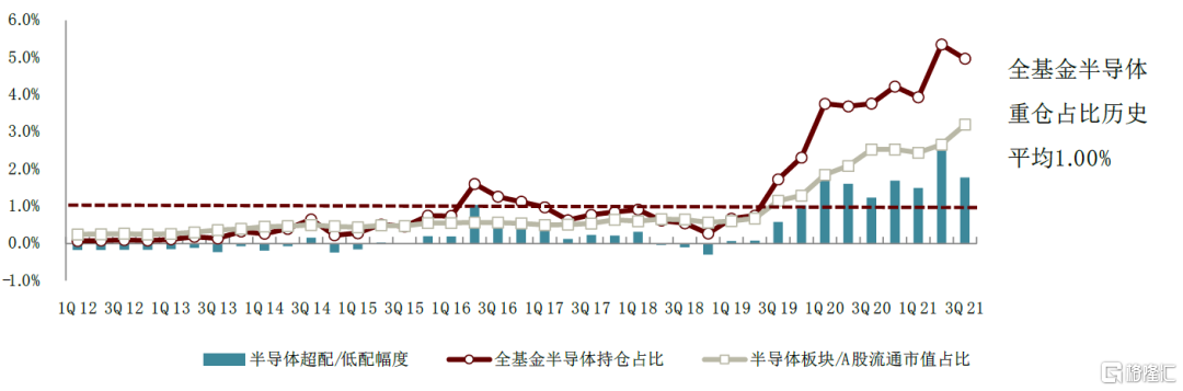 半導體板塊基金持倉比例3Q21略有下滑,仍處在歷史高位。4Q18以來,半導體持倉佔比和超配幅度均明顯上升。截至3Q21,A股全基金半導體持倉佔比爲4.97%,環比下降0.38ppts,超配幅度爲1.77%,高於歷史平均1%的超配水平。