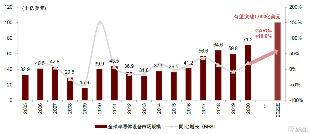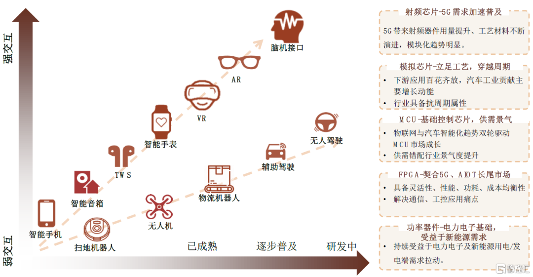 展望2022年,我們認爲隨着新冠疫情對全球經濟的不利影響逐漸減弱及新建產能逐步釋放,半導體產業鏈的供給緊張情況或將得到局部緩解。中長期來看,半導體需求成長動力由手機爲代表的消費電子轉向AIoT、電動汽車、5G通信、新能源、工業等領域,新一輪芯片設計創新週期與國產替代週期有望開啓。隨着國內芯片設計產業蓬勃發展,晶圓製造產能擴張加速,我們看到,目前國內公司在設備、材料以及EDA工具(含IP)等上遊領域快速突破。此外,我們預計2022年或將有多家半導體企業登陸資本市場,帶來更多投資機會。本文圍繞三大產業鏈環節對行業投資機會進行分析。