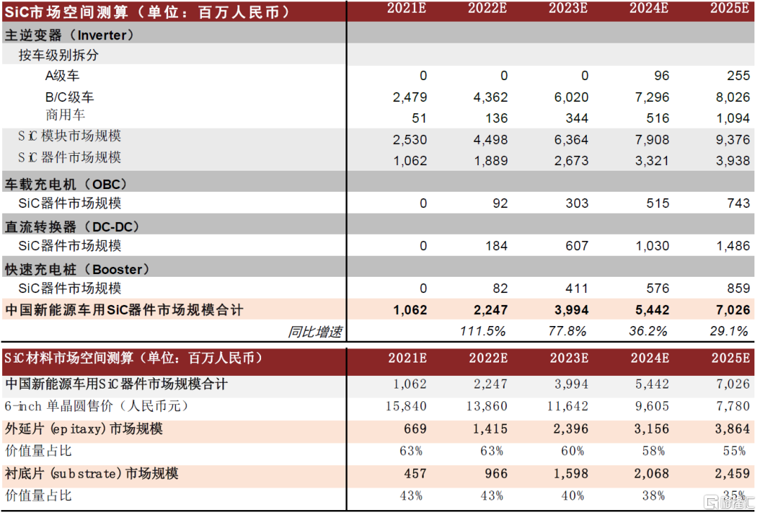 圖表:中國新能源車相關SiC模塊、器件及材料市場測算表