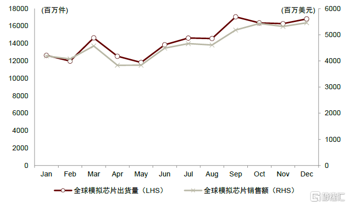模擬芯片行業2021年回顧:行業端,2021年內全球模擬芯片單月出貨量及銷售額波動上行,消費電子、汽車電子、泛工業領域爲國內市場主要驅動力。產能端,據WSTS,2021年全球模擬芯片單月出貨量由1月的126億顆波動上行至9月份的171億顆。價格端,整體來看2021年內全球模擬芯片均價穩中趨降。市場規模端,全球模擬芯片銷售額由1月的41.9億美元上升至9月的51.8億美元。下遊應用端,消費電子、汽車電子、泛工業領域爲國內市場主要驅動力。