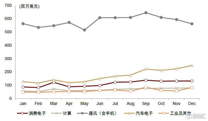 圖表:國內模擬芯片單月銷售額(按下遊應用拆分)