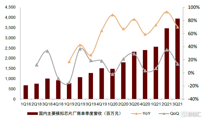 業績端,國內主要模擬芯片廠商業績整體表現強勁,3Q21業績增速趨緩。我們觀察到在一季度傳統淡季後,2Q21國內主要模擬芯片廠商業績迎來強勁兌現,主要系:1)新冠疫情背景下國產替代空間進一步釋放;2)下遊領域拉動模擬芯片需求進一步釋放。