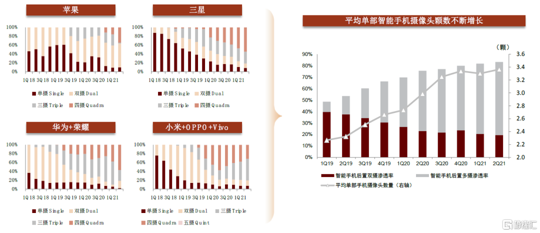 手機鏡頭三攝滲透率持續提升,大像面、高像素趨勢持續。小米、OPPO、Vivo等國產安卓手機品牌部分機型出現四攝降三攝趨勢,但三攝以上方案總體滲透率仍不斷提升;蘋果、三星、華爲、榮耀等廠商仍積極推進四攝方案。大像面、高像素仍爲提升拍照性能的主要因素。