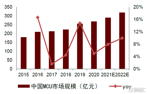 MCU市場空間充足,物聯網和智能汽車雙輪驅動。據IC Insights數據,2020年MCU全球市場規模爲150億美元,2023年預計規模達到188億美元,對應2021-2023年CAGR爲8.0%。從國內市場來看,據IHS預計,2020-2022年MCU國內市場規模的CAGR達9%,未來增速略高於全球。從全球MCU下遊應用領域來看,MCU主要應用於汽車電子、工控/醫療、計算機和消費電子四大領域。汽車電子是全球MCU主要賽道,而消費電子領域則是國內MCU下遊最大市場。