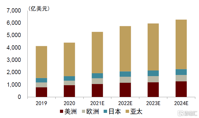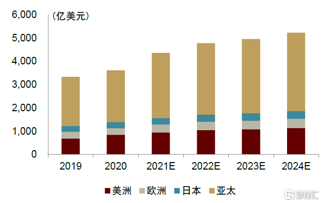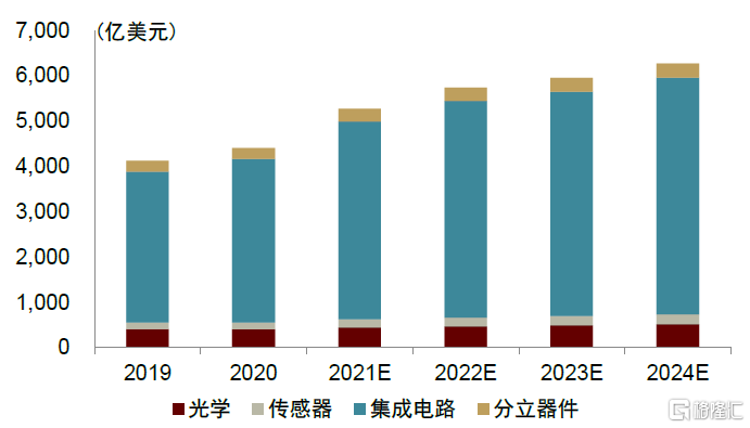 2021年全球半導體市場規模有望達到5272億美元。WSTS預測,2021-2024年全球半導體總產值將達到5,272/5,734/5,949/6,271億美元,同比增速分別爲19.7%/8.8%/3.7%/5.4%,2020-2024年CAGR爲9.2%。地區分佈上看,WSTS預計到2024年美洲/歐洲/日本/亞太地區的半導體總產值分別爲1,269/519/471/4,013億美元。應用場景上看,WSTS預計到2024年光學/傳感器/集成電路/分立器件的細分市場規模分別爲520/210/5,229/312億美元。