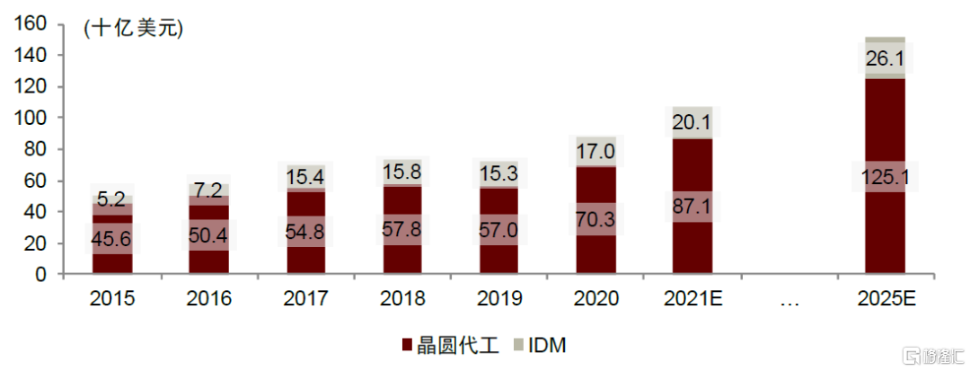 IC Insights預測2021年全球晶圓製造市場規模有望達到1,072億美元,同比增長23%。其中,晶圓代工市場規模有望達到871億美元,同比增長24%。我們認爲2022年全球芯片緊缺有望緩解,但晶圓製造依然維持較高景氣度,全球晶圓製造市場規模依然會保持較爲可觀的增速。IC Insights預測2025年全球晶圓製造市場規模有望達到1,512億美元,2020-2025年保持約11.6% CAGR,其中晶圓代工市場規模有望達到1,251億美元,2020-2025年保持約12.2% CAGR。