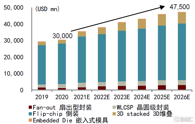 封裝測試:5G、AIoT、汽車電子等下遊需求發展加速,摩爾定律逐步逼近極限,先進封裝正成爲後摩爾時代提升芯片性能的方式之一,並扮演重要角色。Yole預測全球先進封裝市場規模有望從2020年的300億美元提升至2026年的475億美元,我們認爲全產業鏈有望受益此輪技術革新。