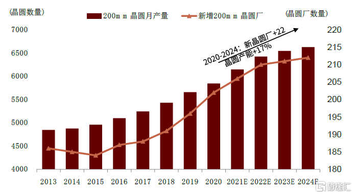 圖表:2013-2024E全球8英寸晶圓產能/晶圓廠數量(200mm即8英寸)