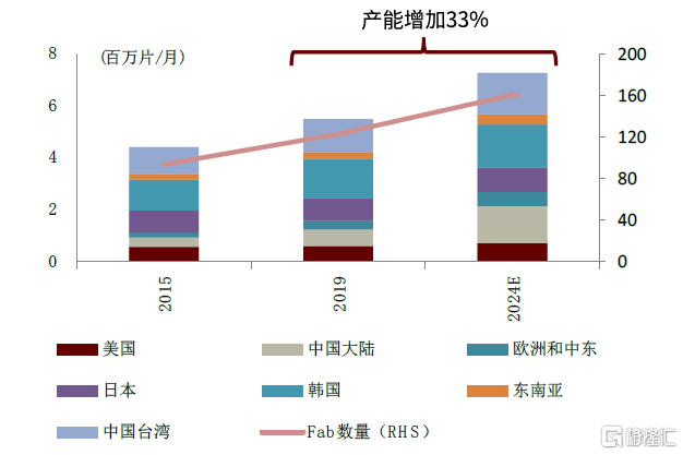 圖表:2015-2024E全球12英寸晶圓產能/晶圓廠數量(300mm即12英寸)