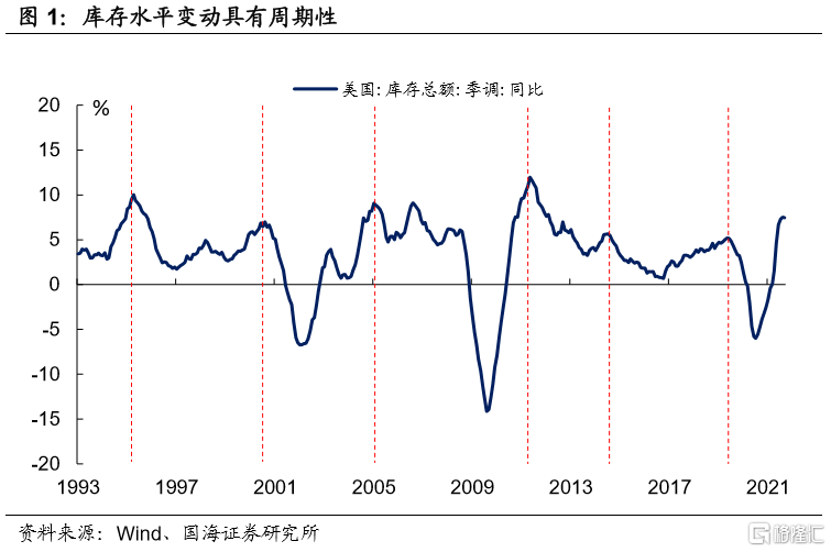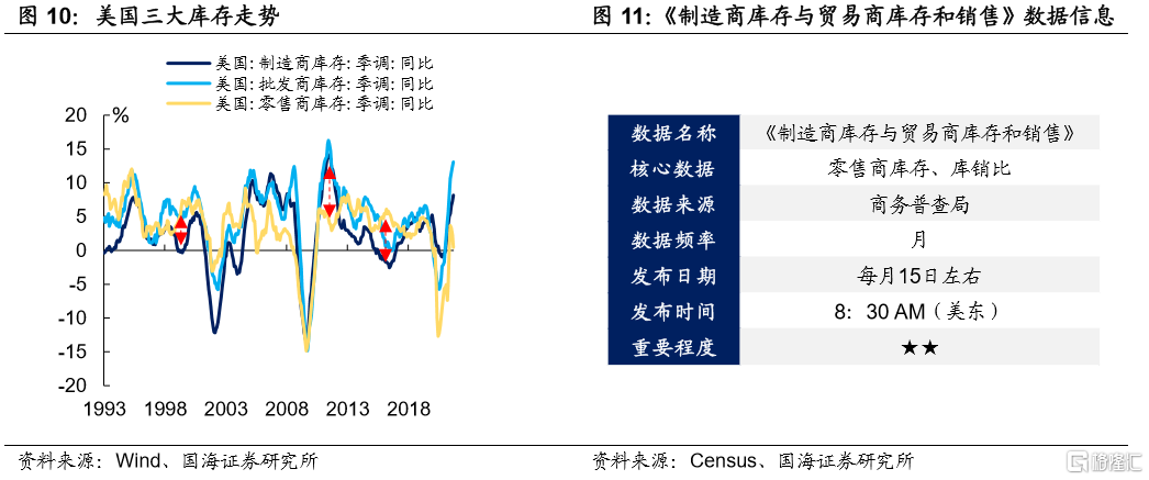 庫存作為美國私人部門投資中的重要一環,雖然佔比不大,但是其週期性表現,對經濟往往也有比較顯著的擾動作用。美國庫存可以分為製造商庫存、批發商庫存和零售商庫存,其中,製造商庫存尤為重要,製造商補庫速率和主要有色金屬的價格走勢高度相關。除此之外,庫銷比通常被用來監測下游需求的情況,和庫存水平呈負相關,通常也被用來作為庫存水平走勢的複驗指標。