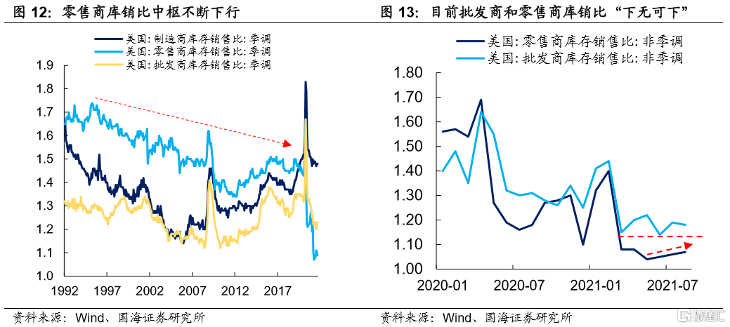疫情以來,在經歷了三輪大規模刺激後,美國居民個人可支配收入劇增,庫銷比不斷下行,而隨着補貼退水,刺激效應邊際減弱,目前美國批發商和零售商庫銷比都已經呈現出“止跌”的跡象,這也預示着美國居民的消費需求也開始逐漸減弱。