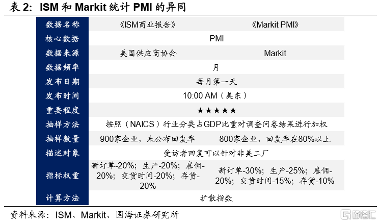 採購經理指數(PMI)數據是所有景氣度指標中“最負盛名”的數據,對生產乃至經濟走勢具有相當的指導性。美國有兩大PMI數據,分別為:(1)美國供應商協會(ISM)統計的PMI數據;(2)金融信息供應商Markit統計的PMI數據。