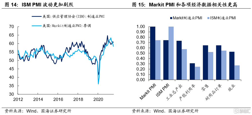 從數據上來看,ISM統計的PMI的波動性較Markit統計的PMI波動性更為強烈,主要原因可能在於:(1)ISM的數據基於受訪者主觀判斷,結果受被訪者直觀感受影響更大;(2)兩者樣本容量不同,雖然ISM覆蓋的企業數量更多,但是其並未公佈其回覆率,實際上可能存在的有效回覆樣本少於Markit PMI。