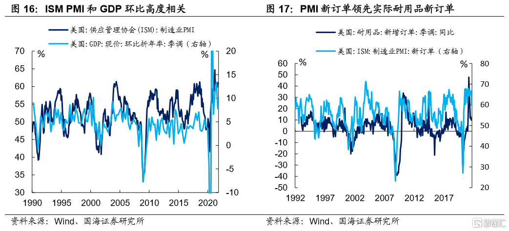 在瞭解了PMI所表徵的意義後,不難發現,PMI和GDP環比存在一定相關性,除此之外,PMI的細分項,對生產製造中的具體環節也存在一定的領先意義。以商務普查局每個月公佈的耐用品新訂單為例,ISM的PMI新訂單指數在趨勢上領先耐用品新訂單1個季度左右。