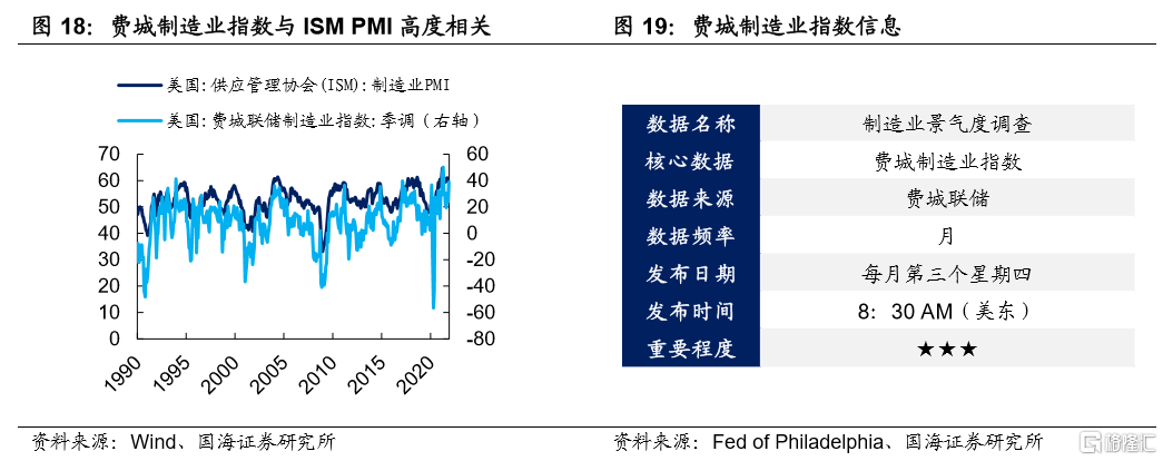 費城製造業指數和PMI採取了相同的統計方法,唯一的區別在於,費城製造業指數以0為“榮枯線”,而非50。從歷史上來看,費城製造業指數和ISM披露的PMI高度相關,其優勢在於披露時間為統計月當月的第三個星期四,披露時間上遠遠領先於ISM和Markit統計的PMI,可以作為PMI的前瞻指標。