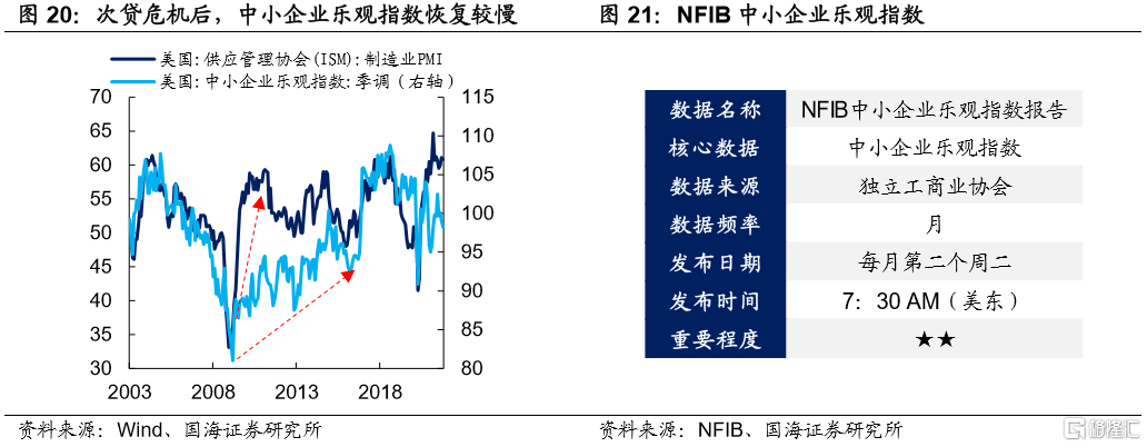 從歷史數據上來看,NFIB和PMI存在一定的相關性,而次貸危機之後存在比較大的背離情況。可能的解釋原因是,中小企業在經歷了比較劇烈的衰退後,對經濟的展望將持更加謹慎的態度,因此,次貸危機之後,PMI的讀數恢復遠快於中小企業樂觀指數。與此同時,由於中小企業樂觀指數的披露時間滯後於PMI數據,因此,市場對該指數的關注程度不及PMI,通常僅用來對PMI數據進行復驗。