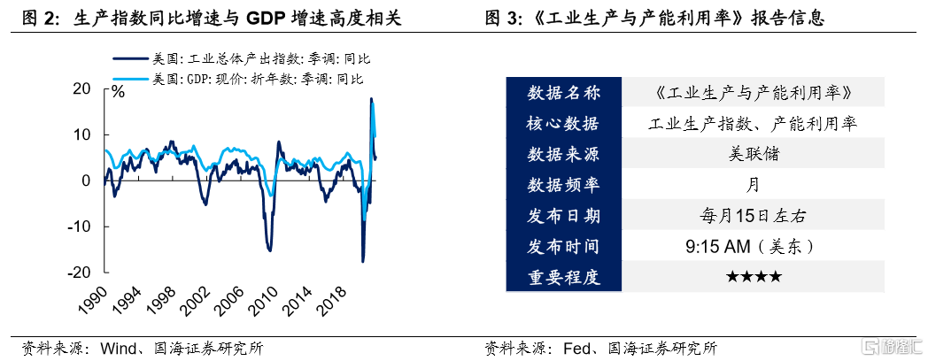 美聯儲每個月發佈的《工業生產與產能利用率》報吿,包含了兩項指數,分別為工業生產指數和產能利用率。其中,工業生產指數用來衡量全美實際產出,與經濟增速高度相關,而產能利用率則以百分比的形式衡量了全美生產能力的開啟情況。