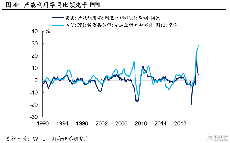 產能利用率通常可以用來被視作生產端通脹的領先指標。從歷史上來看,產能利用率的同比變化對製造業材料價格有一定的領先作用。既當產能同比增長較快時,對原材料的需求也會相應抬升,使得原材料供需關係趨緊進而使得原材料價格走高。