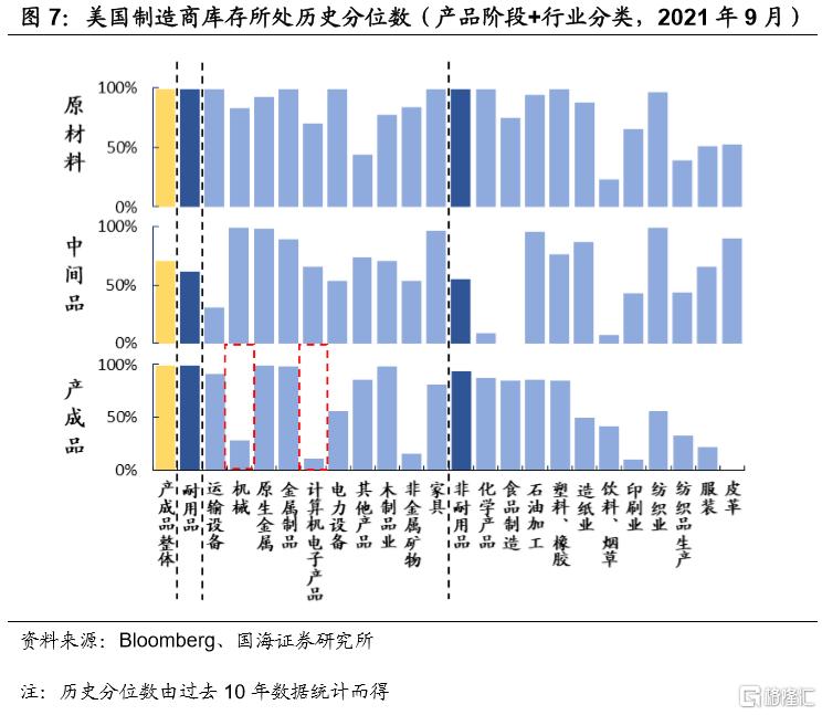 在M3報吿中,庫存數據對於經濟的重要性尤為重要。製造商庫存數據以金額為單位,衡量庫存的名義價值水平,由3項指數組成:(1)製造商總庫存;(2)製造商庫存按NAICS行業分類;(3)製造商庫存按產品階段分類。由於庫存水平以名義價值進行統計,因此,通常而言我們用同比增速所處歷史分位數來衡量制造業庫存水平。疫情後,美國庫存水平驟降,在經歷了將近1年半的補庫後,目前美國製造業庫存整體水平不低,然而上下游存在一定分化現象,下游運輸設備和計算機電子產品庫存在全球“缺芯”和需求旺盛的格局下,目前庫存水平依舊較低。
