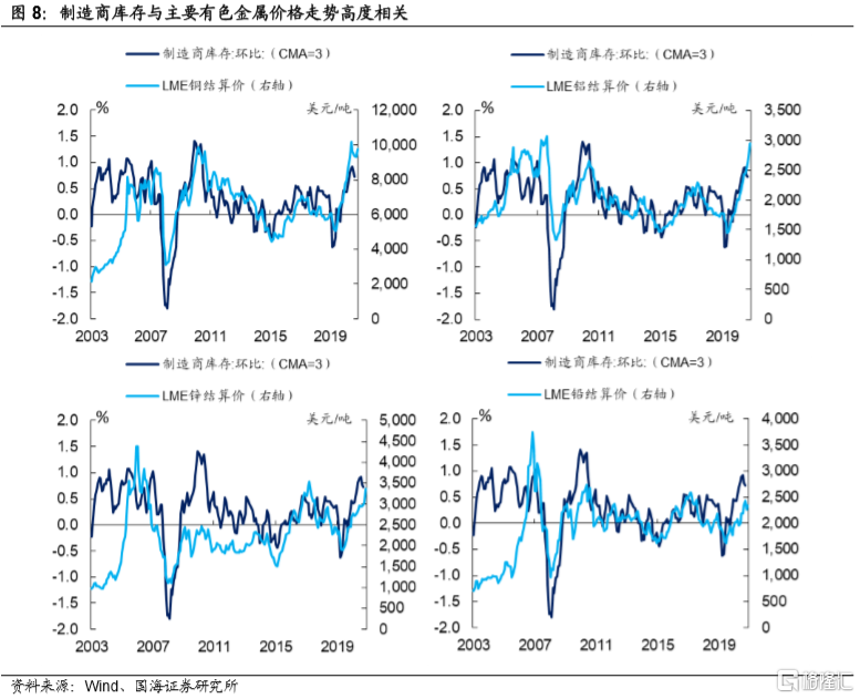 我們在《大宗商品價格還能漲多久?》中曾經介紹了美國製造商庫存和主要有色金屬價格走勢高度相關。從歷史上來看,製造商庫存環比增速的3個月移動平均值對以銅、鋁、鋅、鉛為代表的有色金屬價格存在一定的領先作用。目前,製造業庫存環比增速已經開始下行,這也意味着當前處於高位的有色金屬價格繼續上行的空間相對比較有限。