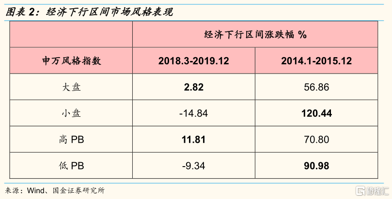 大盤與小盤風格:經濟下行階段,大盤股的經營規模優勢更爲凸顯,小盤股在低增長階段獲取市場份額難度更高。從另外一個維度來看,小盤股融資能力較弱,經濟下行階段如果伴隨着信用寬鬆政策,小盤股的融資環境邊際改善幅度或更大。