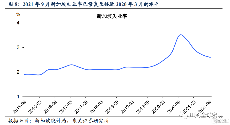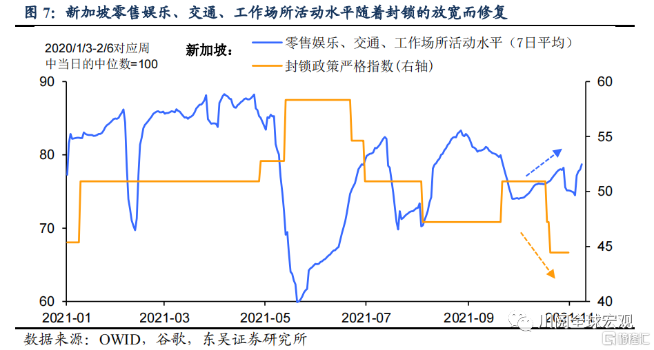 放寬政策對新加坡經濟的影響如何?零售娛樂、交通、工作場所活動逐漸修復,2021 年11月疫情反彈得到控制後,上述活動恢復至近疫情爆發前水平的80%(圖7)。