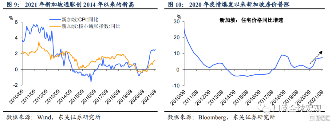 通脹方面,在全球糧食生產和供應鏈中斷、能源和房屋價格攀升等因素的共同作用下,新加坡通脹在2021 年5月創下2014 年以來的新高,並在後續4 個月維持高位(圖9、圖10),新加坡金管局預計進口通脹將持續至2022 年。