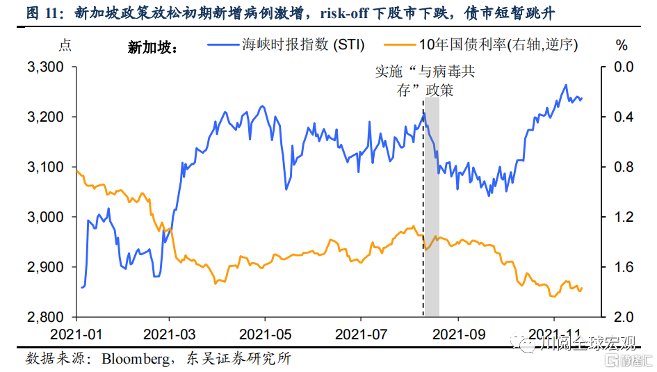 放寬政策對新加坡金融市場的影響又如何?政策放鬆初期新增病例激增,risk-off 下股市下跌,債市短暫跳升(圖11)。後續疫情逐步得到控制,股市強勁回升並創年內新高。債市方面,由於10 月新加坡金管局爲應對通脹,超預期小幅收緊貨幣政策,導致債市下跌。