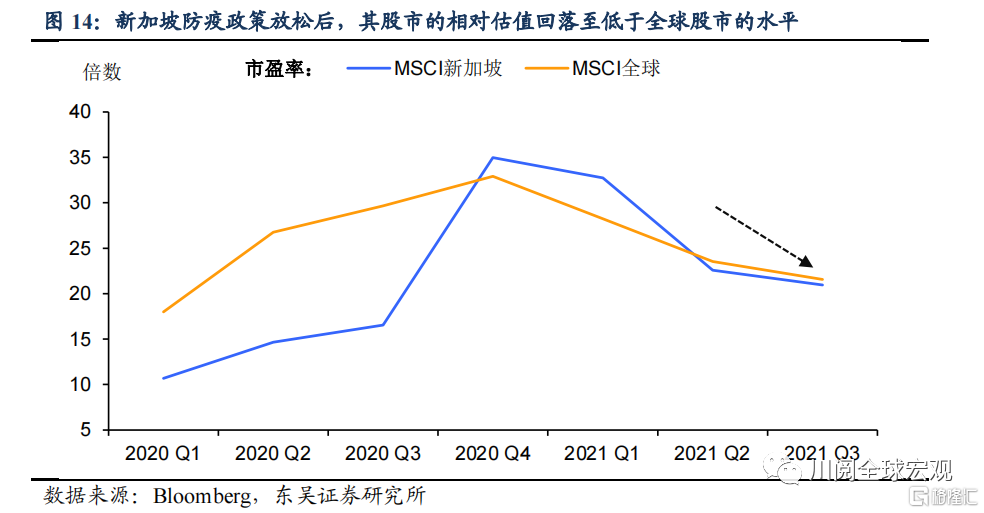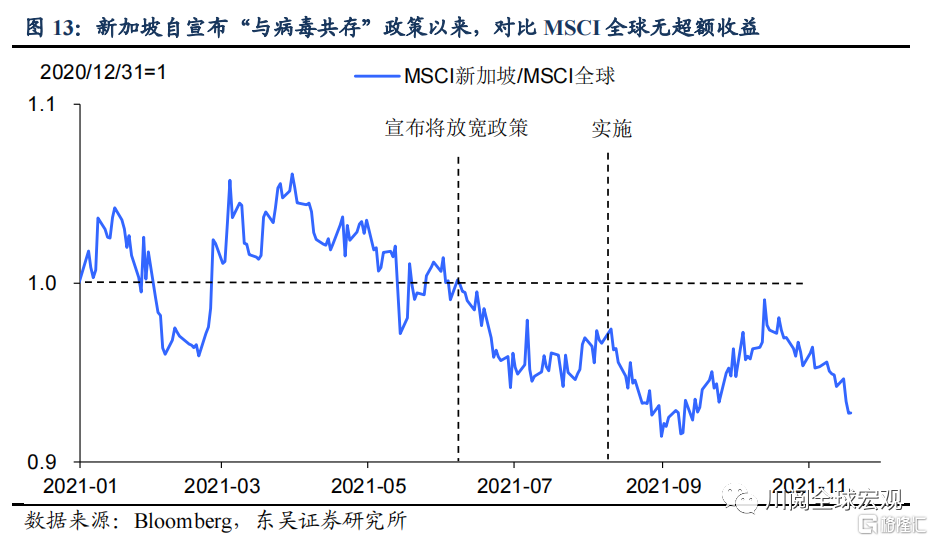 新加坡自宣佈“與病毒共存”政策以來,對比MSCI 全球無超額收益(圖13)。原因主要在於新加坡在放寬政策前,對於疫情的控制處於全球前列,日新增病例維持在兩位數,股市相對估值較高,政策放寬後的疫情反撲下,不再具備相對優勢,估值回落(圖14)。