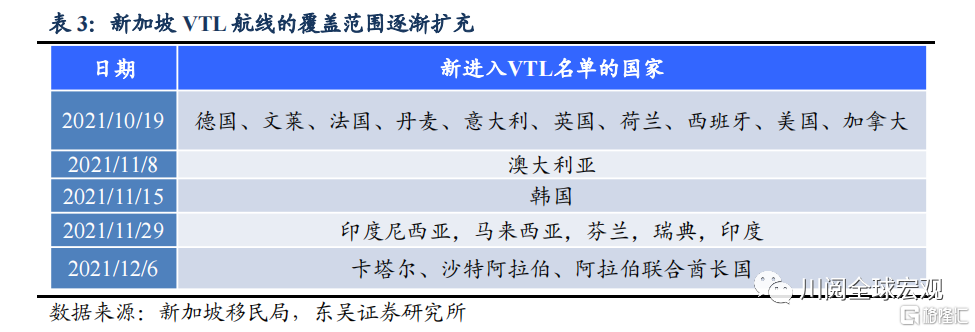 新加坡如何放寬邊境管控?2021年8月19日開啓“旅行走廊計劃”(Vaccinated Travel Lane,VTL)免隔離航線,並逐漸擴充其覆蓋範圍(表3)。VTL 乘客已完成接種,並且在出行前及抵達新加坡後都進行核酸檢測。新加坡密切跟蹤跨境旅行,核心關注點從“零容忍”時期的防止受感染人員入境,變成不對醫療系統帶來嚴重壓力(heavy burden)。簽證方面,從8 月10 日起,新加坡已經恢復完成疫苗接種的工籤持有者及其家人的入境批準。