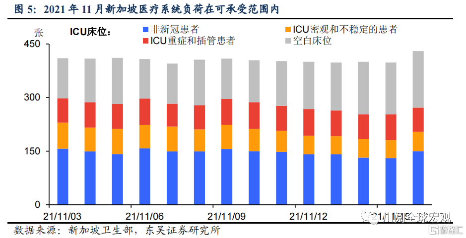 政策放開後,新加坡如何應對疫情反撲?2021年8月放寬室內就餐限制後,新增確診人數在幾周內從兩位數飆升至過千(圖2),爲了降低傳播率,最大限度地減少對醫療系統的壓力,新加坡於9月27日進入穩定期並於10月20日宣佈延長穩定期四周,新增病例數於11月2日達到峯值,後續回落。在此期間,儘管新冠病例數激增,但是重症和死亡率維持在可控範圍內,醫療系統負荷在可承受範圍內,並且感染率呈下行趨勢(圖3至圖6)。