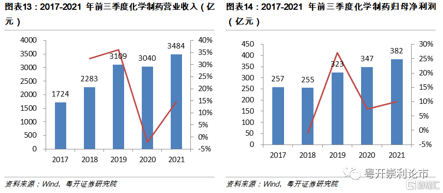 2021年三季度化學制藥板塊實現淨利潤382億元,同比增長10.07%。截至2021年三季度,化學制藥板塊實現營業收入3484億元,同比增長14.63%;實現歸母淨利潤382億元,同比增長10.07%。增速的提升得益於新冠疫情影響衰減,市場需求逐步恢復。近年來,在限抗令、帶量採購、醫保談判的持續推進下,化學藥品價格處於下跌通道,行業增速放緩,但放緩並不意味着缺少投資機會,一批製藥企業正積極開展創新研發,行業整體向仿創結合階段邁進。未來隨着國內製藥企業研發實力的不斷提升,創新藥品佔比持續增長,我國化學藥市場發展潛力巨大。