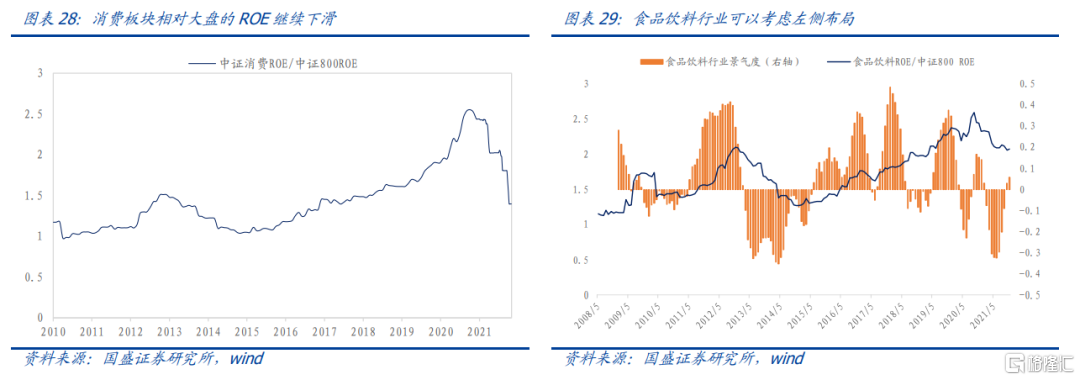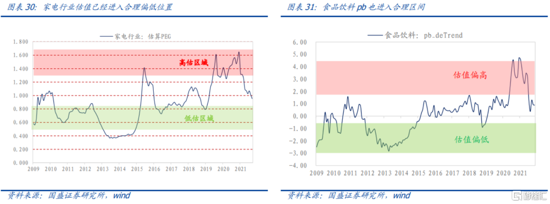 但是板塊內部可能已出現結構分化。根據我們編制的分析師景氣指數,消費板塊中食品飲料、家電等行業的景氣度已進入擴張區間。從估值層面來看,家電和食品飲料的估值也已經進入合理區間,因此可以考慮左側佈局家電和食品飲料。