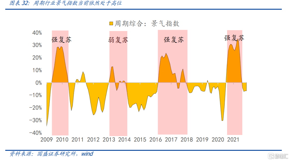 週期行業景氣指數最新爲-7%,模型顯示當前進入景氣收縮區間,再疊加第一章節預測PPI在2022年會明顯下滑,建議週期行業低配!