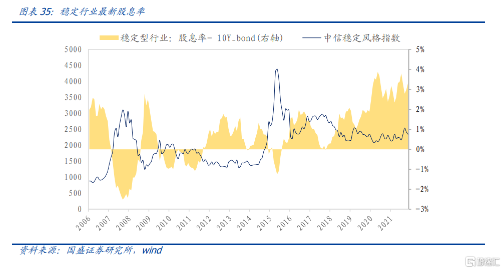 穩定行業的核心影響因素是股息率。當前穩定型行業股息率和十年國債收益率的差值約爲3.3%。從絕對收益角度來講,當前是配置穩定型行業很好的時點。