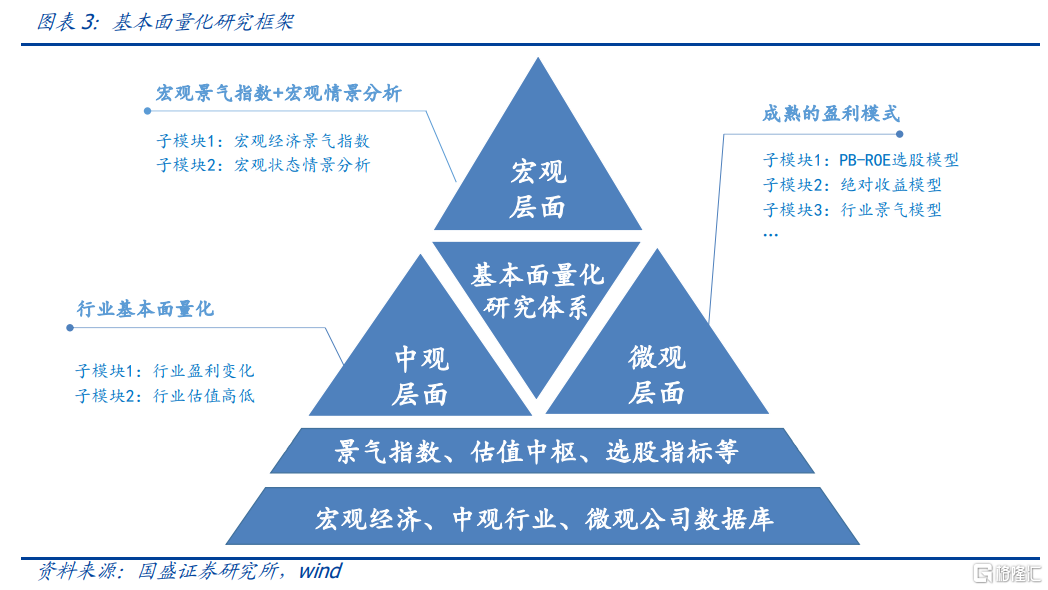 基本面量化體系介紹。1) 宏觀層面:主要研究宏觀景氣指數+宏觀情景分析。2) 中觀層面:主要研究行業的盈利變化和估值高低。3) 微觀層面:從成熟的盈利模式出發,構建具體投資策略,目前跟蹤的模型包括:PB-ROE選股模型、行業景氣度模型、絕對收益模型等。