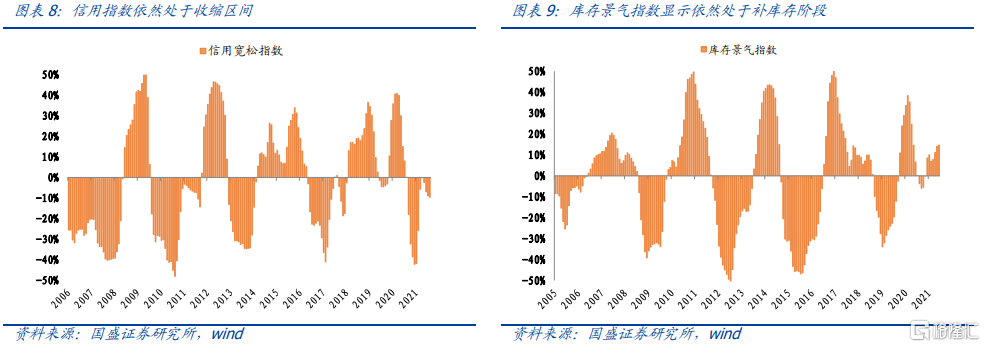 宏觀層面:1) 宏觀景氣指數:目前總體觀點爲經濟下、貨幣鬆、信用緊、補庫存。2) 宏觀情景分析:預計滬深300盈利增速接下來繼續下行,PPI指數在2022年會明顯下滑,庫存週期進入被動補庫存階段。