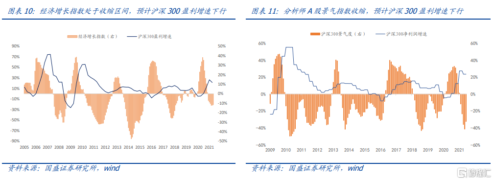 目前我們有兩套方案來做經濟情景分析,可以用來相互驗證,分別爲自上而下的經濟增長指數和自下而上的分析師A股景氣指數。目前經濟增長指數和分析師A股景氣指數都處於收縮區間,預計滬深300盈利增速接下來繼續下行。