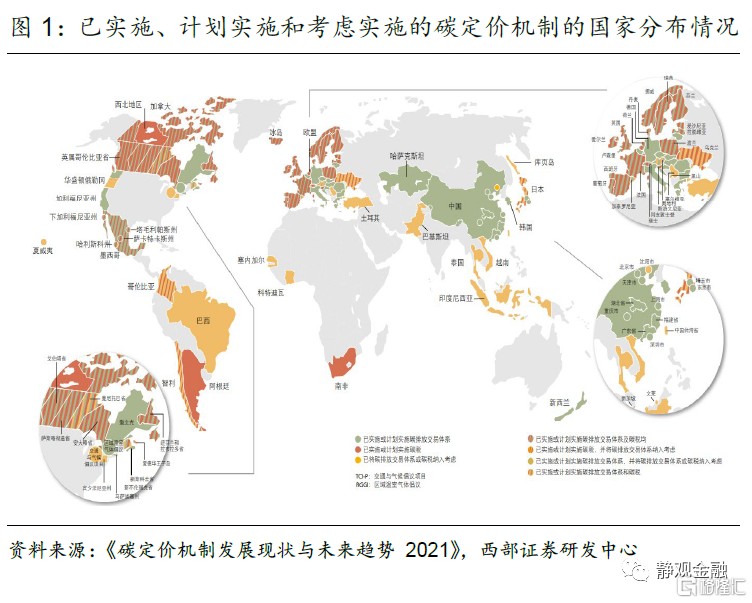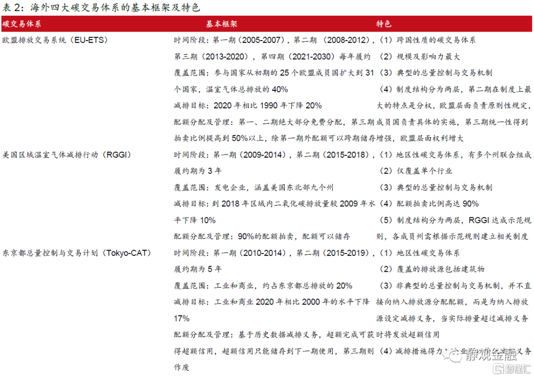 目前,全球範圍以及湧現出一批碳交易體系,主要包括歐盟排放交易系統(EU-ETS)、新西蘭碳交易體系(NZ-ETS)、澳大利亞碳定價體系(ACPM)、日本東京都總量控制和交易計劃(Tokyo-CAT)、美國區域温室氣體減排行動 (RGGI)、美國加州總量控制與交易計劃(CCAT)。